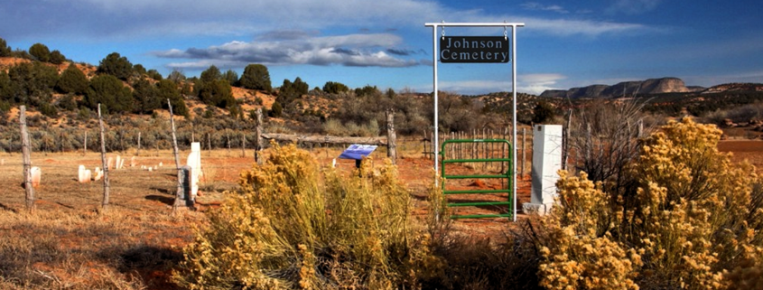 The cemetery is easy enough to find. Just take Highway 89 east from Kanab for about 12 miles and hang a left on Johnson Canyon Road. The cemetery is about 4.5 miles up the highway on the left. There is a home with several cows in a field to the south immediately next to it. Just beyond the house is a small gate, usually open during the summer months, that has a rutted, sandy path to the cemetery. The cemetery is visible from the gate.